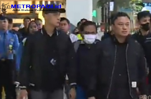Rudi tampak berjalan keluar bandara dikawal oleh para penyidik. Dia tampak mengenakan kaus polo berwarna navy dan wajahnya ditutupi masker putih.