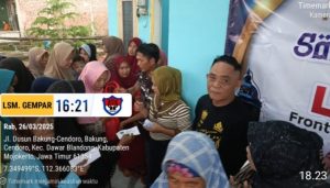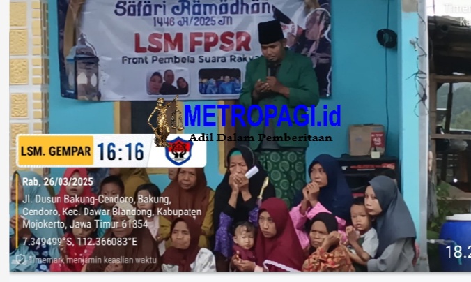METROPAGI.ID, MOJOKERTO – Ketua Lembaga Swadaya Masyarakat Front Pembela Suara Rakyat (LSM FPSR) membagikan ratusan paket sembako dan uang tunai kepada masyarakat di wilayah Kecamatan Dawarblandong (Kabupaten Mojokerto) dan Kecamatan Driyorejo (Kabupaten Gresik). Bhakti sosial tersebut dilakukan 4 hari menjelang Lebaran Idul Fitri 1446 Hijriyah atau hari ke-25 di bulan Puasa Ramadhan.
