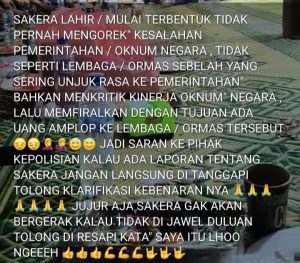 “Jadi, saran untuk pihak kepolisian, kalau ada laporan tentang Sakera jangan langsung ditanggapi, mohon klarifikasi dulu kebenarannya. Jujur saja Sakera tidak akan bergerak kalau tidak diprovokasi terlebih dahulu. Tolong resapi kata-kata saya itu, nggeh.” kata Potongan whatsap yang beredar.