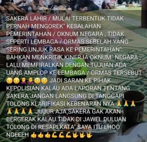 “Jadi, saran untuk pihak kepolisian, kalau ada laporan tentang Sakera jangan langsung ditanggapi, mohon klarifikasi dulu kebenarannya. Jujur saja Sakera tidak akan bergerak kalau tidak diprovokasi terlebih dahulu. Tolong resapi kata-kata saya itu, nggeh.” kata Potongan whatsap yang beredar.