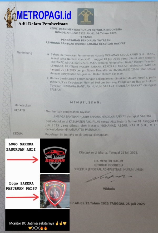 METROPAGI.ID, PASURUAN — Beredar di status WhatsApp dua foto berlogo “SAKERA”, salah satunya menampilkan gambar mobil sport, yang diklaim sebagai logo resmi oleh pihak LPKSM SAKERA. Pihak tersebut juga menyebut bahwa logo lain, bergambar seseorang sambil memegang celurit dan timbangan hukum, adalah palsu.