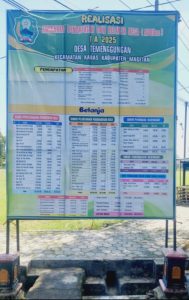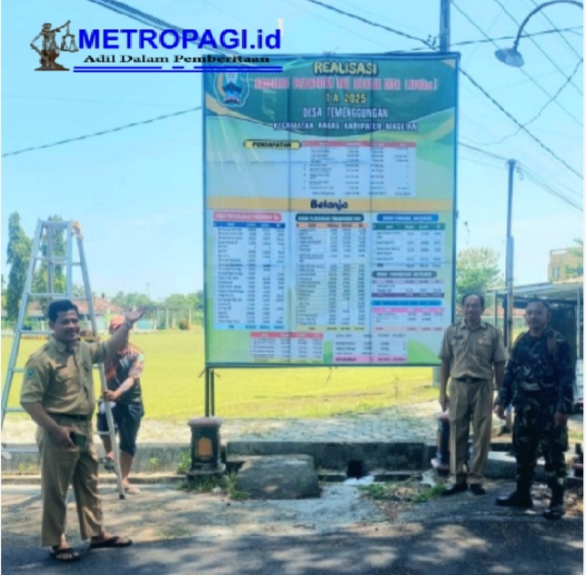 METROPAGI.ID, MAGETAN –  20 April 2026 – Pemerintah Desa Temenggungan, Kecamatan Karas, Kabupaten Magetan, secara resmi memasang baliho informasi realisasi Anggaran Pendapatan dan Belanja Desa (APBDes) Tahun Anggaran 2025 di titik strategis yang mudah diakses warga, sebagai wujud komitmen keterbukaan dan akuntabilitas pengelolaan keuangan desa. Langkah ini dipimpin langsung oleh Penjabat Kepala Desa (Pj Kades) Temenggungan, Subono, yang menekankan bahwa informasi pembangunan harus dapat dilihat, diketahui, dan dipahami oleh seluruh masyarakat.