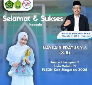 METROPAGI.ID, MAGETAN– Kamis, 23 April 2026 – Ajang Festival dan Lomba Seni Siswa Nasional (FLS3N) tingkat Kabupaten Magetan tahun 2026 menjadi panggung kebanggaan bagi Madrasah Aliyah Negeri (MAN) 3 Magetan. Setelah Hanifatul Hiyaroh siswi kelas XI E meraih Juara 2 cabang Menulis Cerpen, dua siswi berbakat lainnya kembali mengharumkan nama madrasah dengan menyabet penghargaan Juara Harapan 1, masing-masing di cabang Desain Grafis dan Solo Vokal PI.